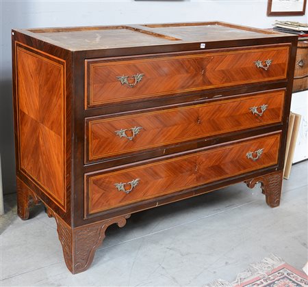 Antico comò a tre cassetti lastronato in bois de rose e bois violet. Mancante...