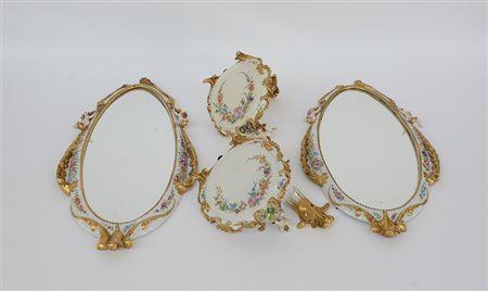 Coppia di due specchierine ovali con console in porcellana dipinta a fiori e...
