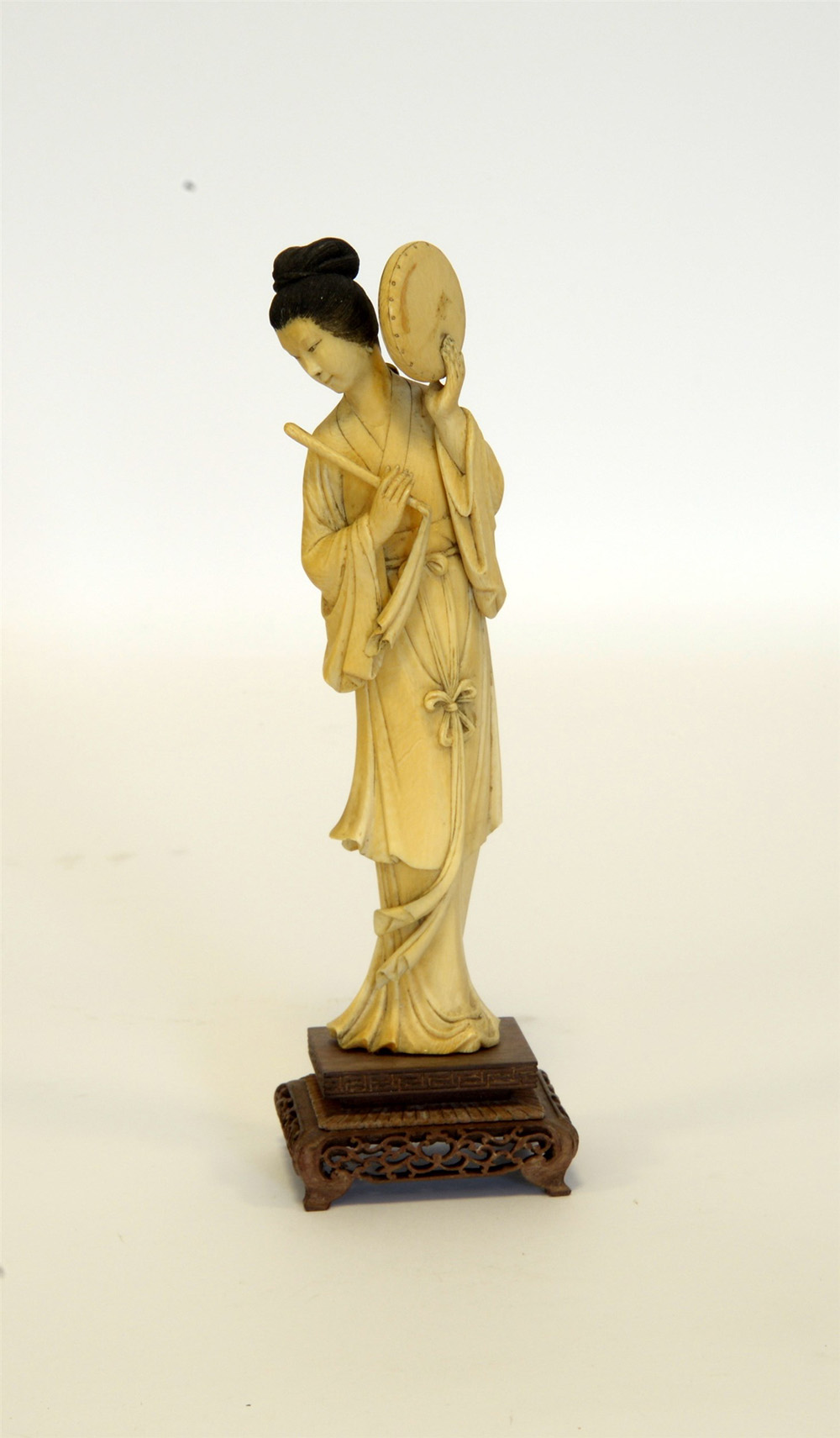 Scultura in avorio raffigurante dama dalle lunghe vesti con tamburello, base in legno (difetti)
