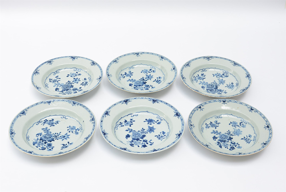 Sei piatti fondi in porcellana bianca e blu da esportazione (difetti)Cina,...