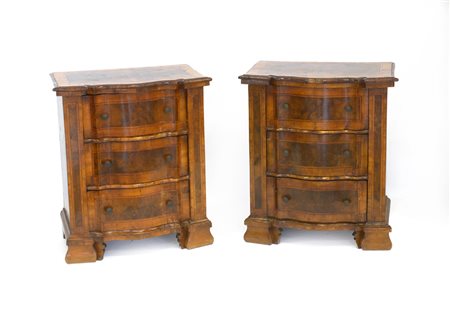 Coppia di comodini impiallacciati in noce e radica di forma sagomata, tre lesene ebanizzate. Italia Settentrionale, sec. XVIII (restauri)