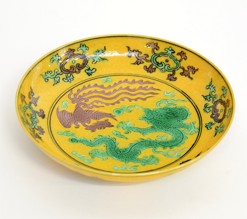 Piccolo piatto in porcellana a tre colori decorato con coppia di draghi,...