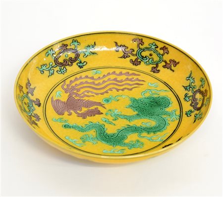 Piccolo piatto in porcellana a tre colori decorato con coppia di draghi, marchio apocrifo Qianlong alla base Cina, sec. XX (diam. 13,5 cm.)