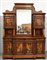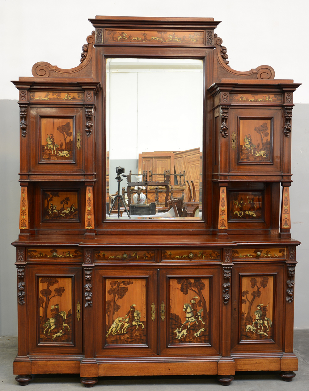 Grande credenza a due corpi di struttura architettonica con alzata a specchio, pannelli intarsiati con inserti in avorio raffiguranti scene di caccia (cm 134x264x61) (difetti)