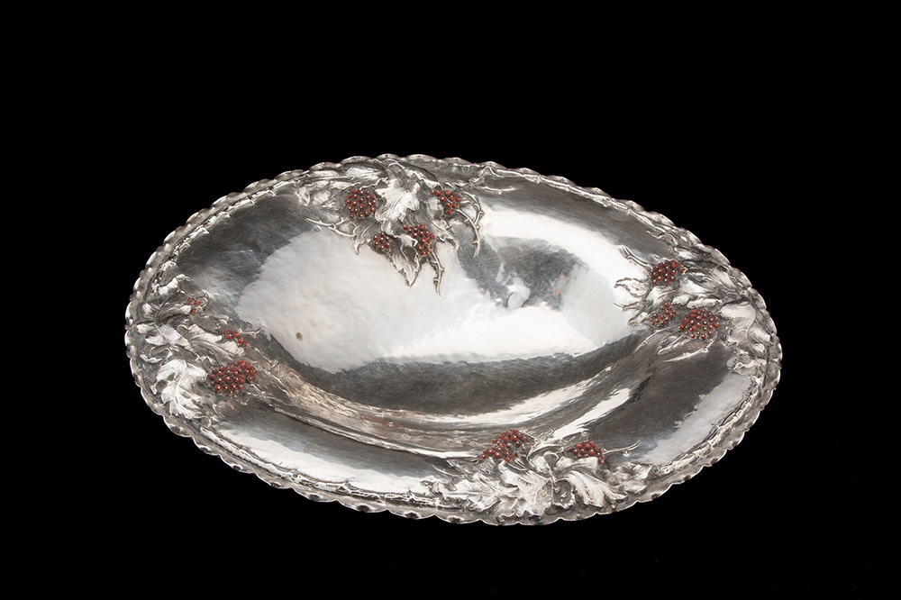 Alzata centrotavola in argento di forma ovale, con tesa decorata a rami e...