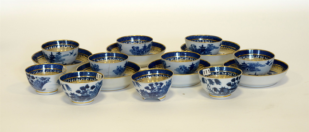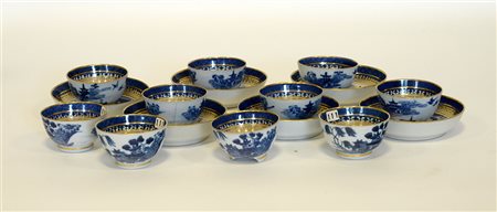 Lotto composto da sei piatti e dieci coppette in porcellana nei toni del blu e oro (gravi difetti)