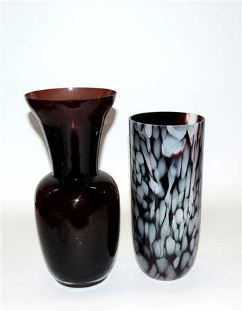 Lotto composto da un vaso a balaustro in vetro bordeaux e da un vaso a cilindro in vetro policromo bordeaux, misure diverse