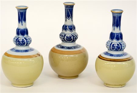Tre piccoli vasi a bottiglia in porcellana a decoro bianco, blu e caffelatte. Cina, sec. XX (h. 17 cm.)