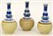 Tre piccoli vasi a bottiglia in porcellana a decoro bianco, blu e caffelatte....