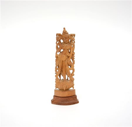 Scultura in legno raffigurante divinità tra fiori di loto con base (lievi difetti)