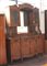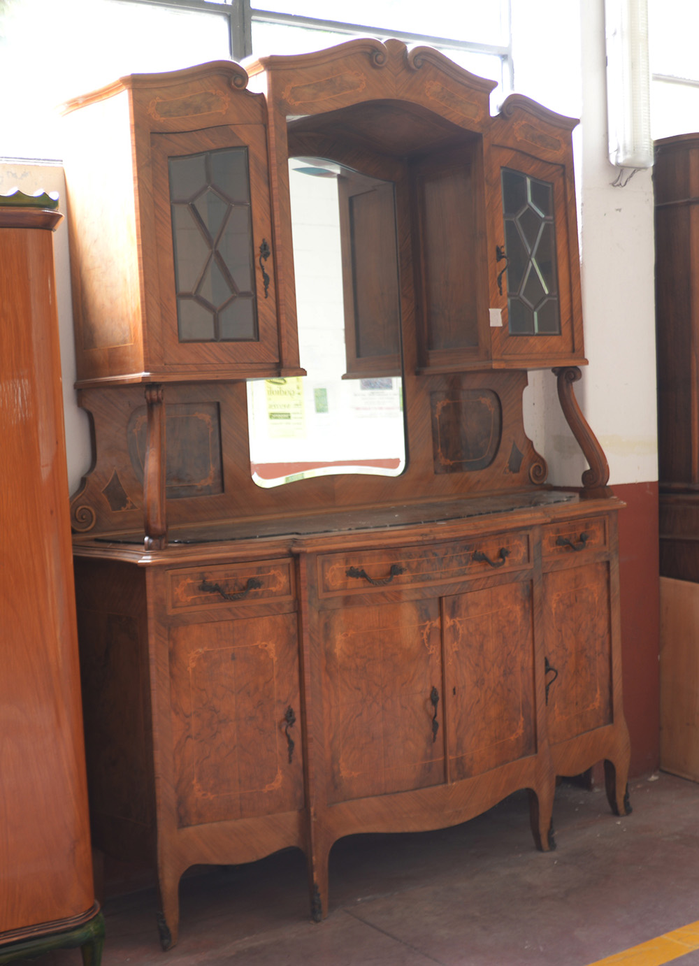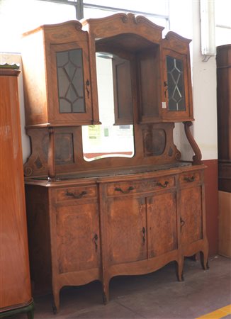 Credenza a due corpi lastronata in noce, radica e piuma. Parte superiore a due ante a vetro a specchio, parte inferiore a tre cassetti e quattro sportelli, piano in marmo (cm 180x230x50)(difetti)