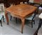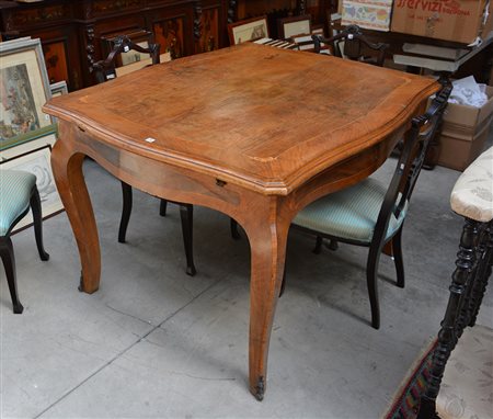 Tavolo di forma sagomata lastronato in noce e radica di noce e filettato in...
