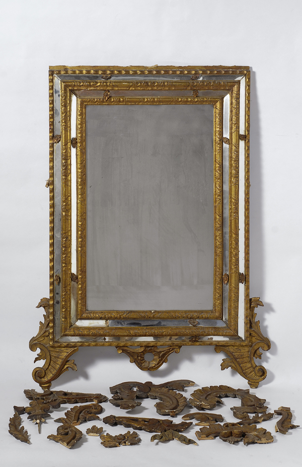 Specchiera in legno in dorato e intagliato a doppia cornice, con inserti ad ovoli, cimasa a volute traforata. cm. h. 90x160 € 500/700