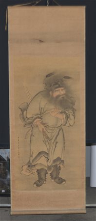 Inchiostro e colore su seta. Scroll verticale raffigurante guerriero con...