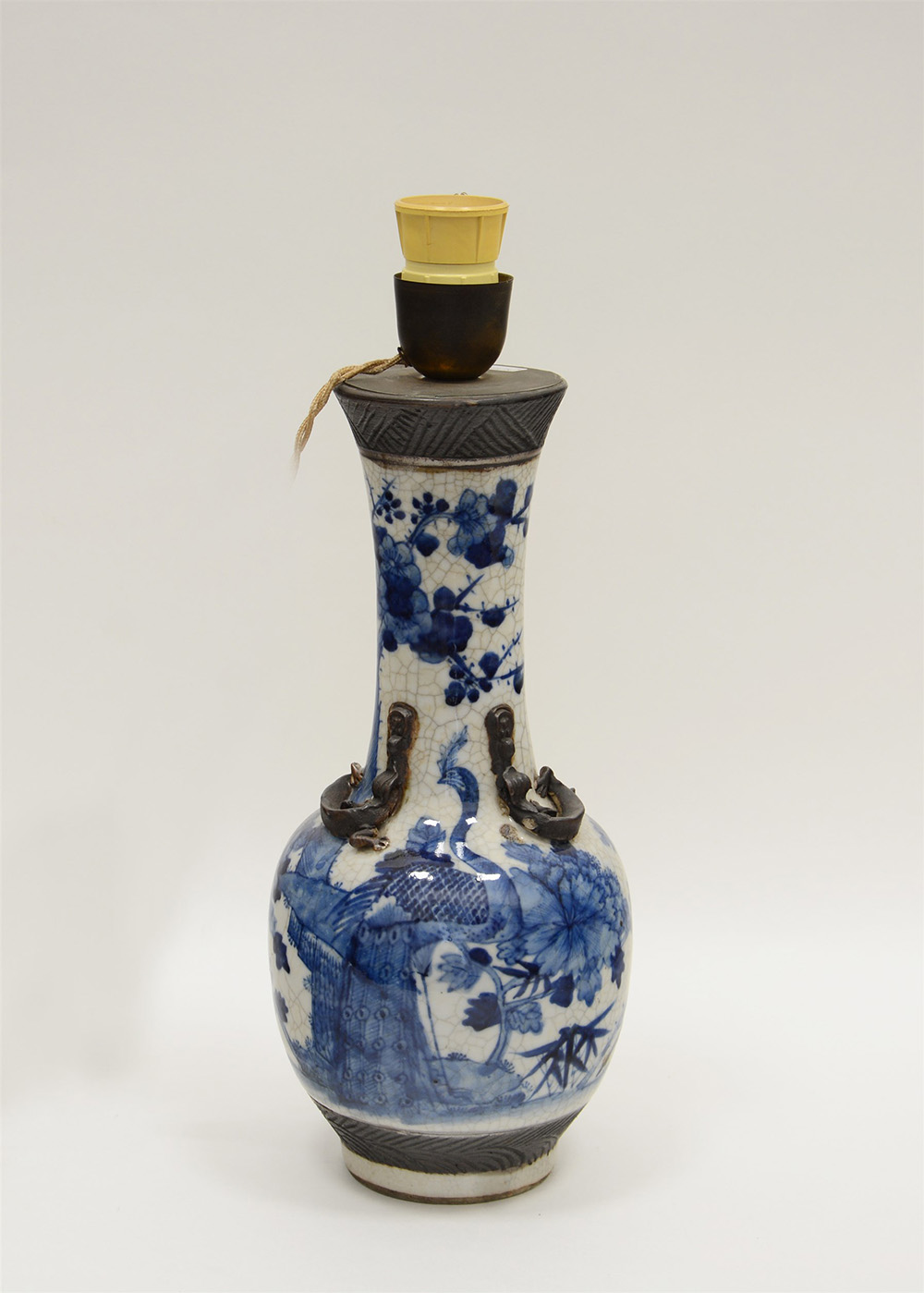 Vaso in porcellana bianca e blu su fondo craquelé montato a lampada, marchio apocrifo Chenghua alla base (difetti)