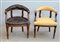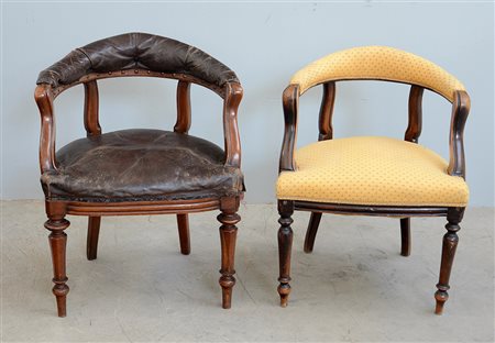 Coppia di poltroncine in noce con schienale sagomato a giorno, montanti e braccioli mossi. Gambe tornite. Sec. XIX (difetti)