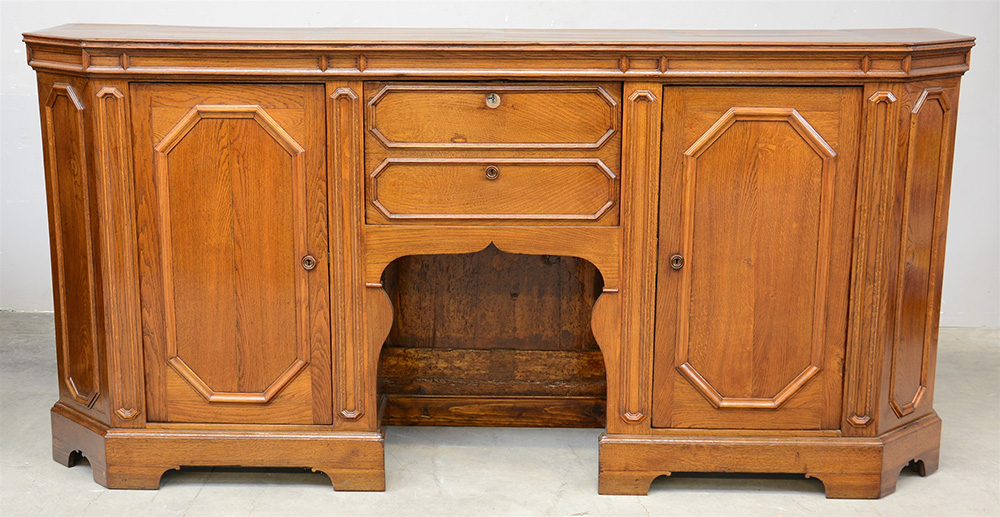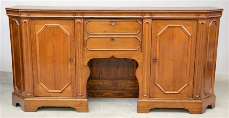 Credenza in legno dolce a due sportelli, vano centrale trasformabile in scrittoio con calatoia celante cassetti e vano porta carte, piedi a mensola (cm 228x110x54) (difetti e restauri)