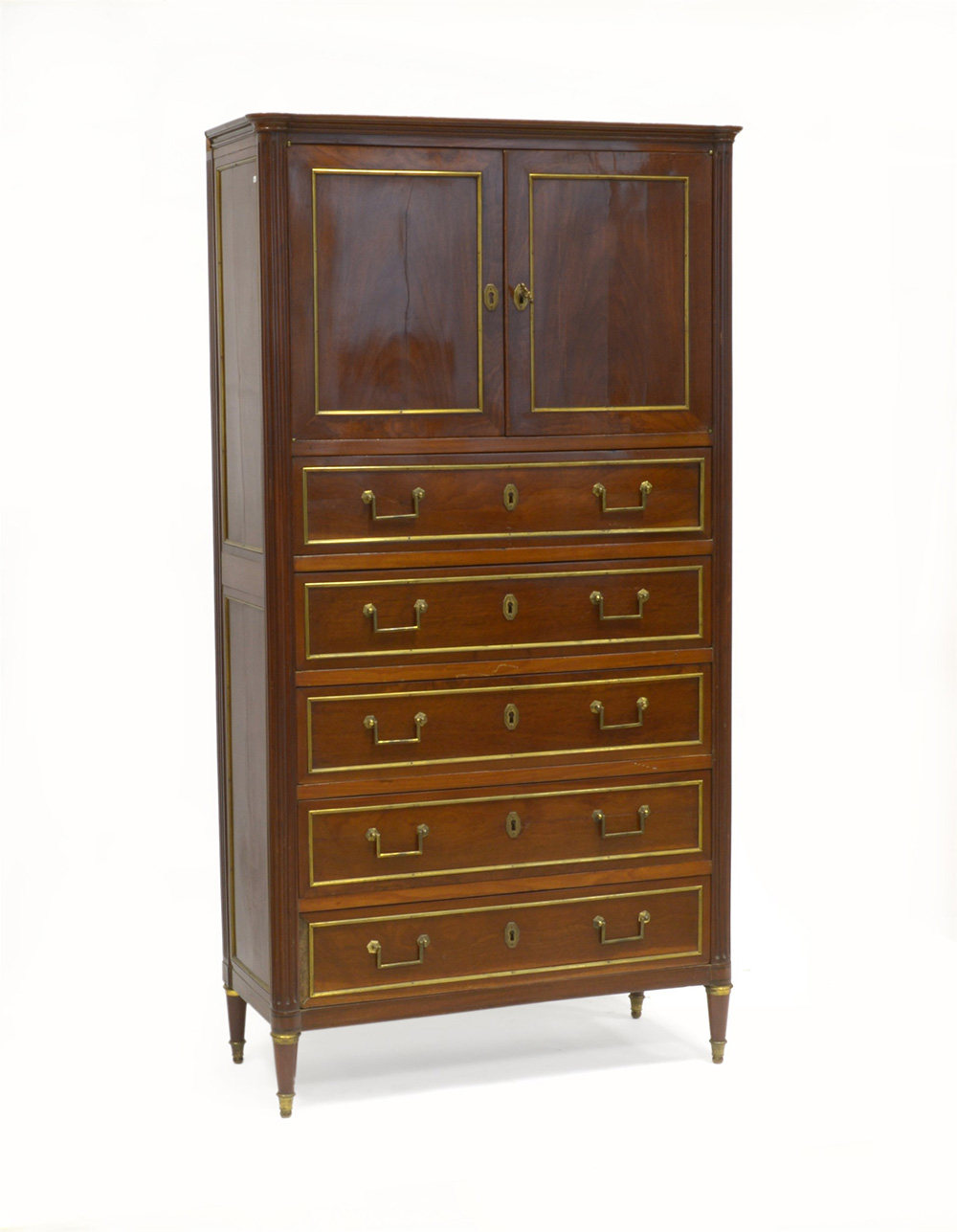 Secretaire con fronte a cinque cassetti e due ante celanti vano. Profili in ottone. Gambe tornite munite di scarpette. Sec. XIX (cm 94x178x42) (difetti)