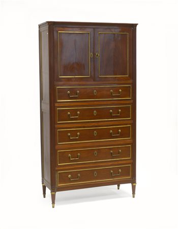 Secretaire con fronte a cinque cassetti e due ante celanti vano. Profili in...