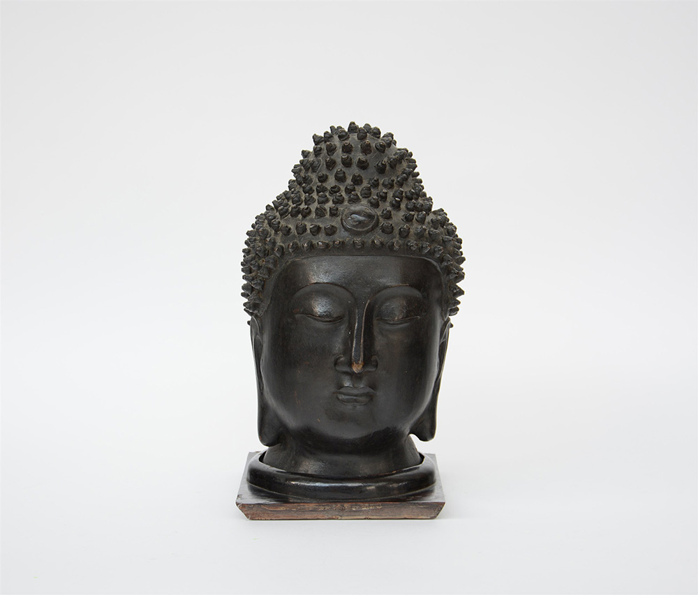 Testa in bronzo raffigurante Buddha (riparo al retro del bordo), con base in legno