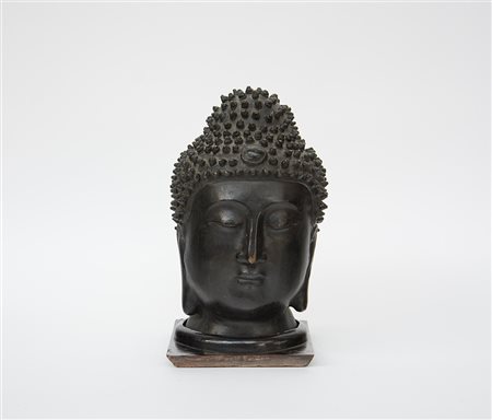 Testa in bronzo raffigurante Buddha (riparo al retro del bordo), con base in...