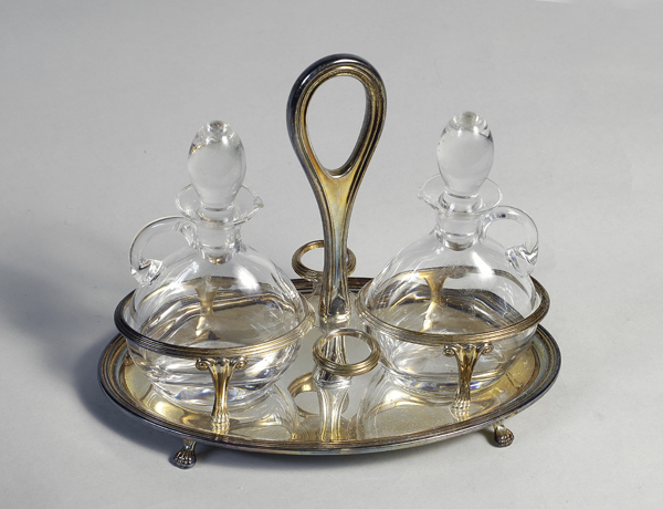 Porta olio e aceto in argento con vassoietto ovale, bolli 800 € 250/350