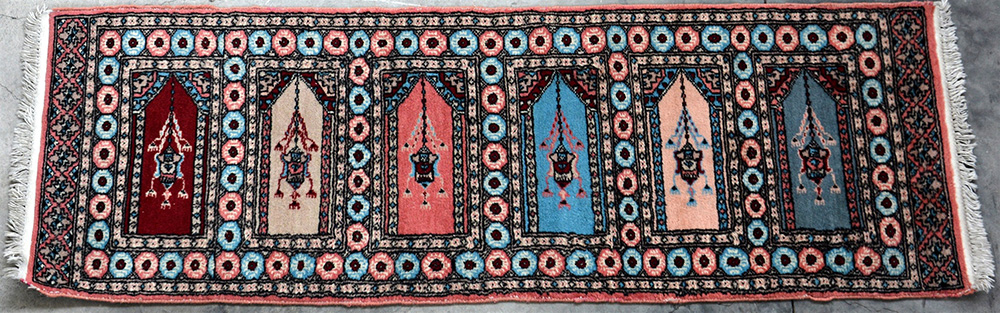 Tappeto Saph, Pakistan, secolo XX. Preghiera con decoro a sei Mirab...