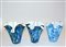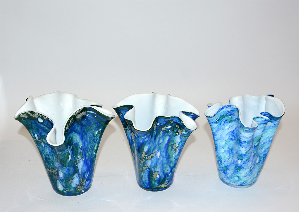 Lotto composto da tre vasi a fazzoletto in vetro a decoro marmorizzato nei toni del blu (h max cm 21)