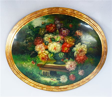 Pannello decorativo in legno a forma di ovale raffigurante fiori (cm 48x60)