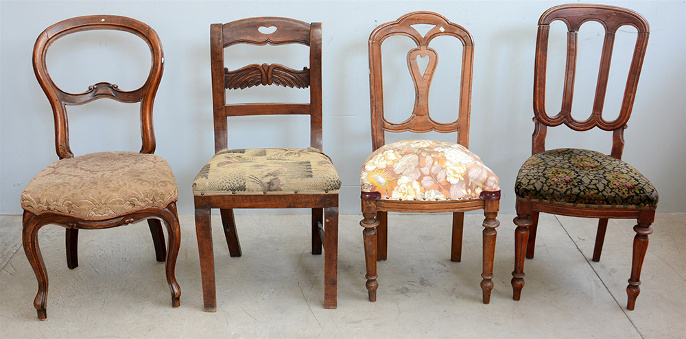Lotto composto da quattro sedie di forme e epoche diverse (difetti e mancanze)