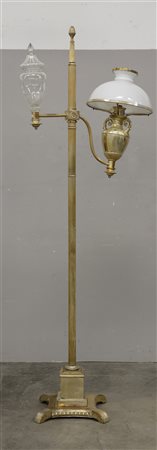 Lampada da terra in metallo scanalato a due bracci, uno reggente una lampada ad olio montata a luce elettrica, con paralume in vetro lattimo, l'altro reggente un contenitore con coperchio in vetro (h cm 200) (difetti)