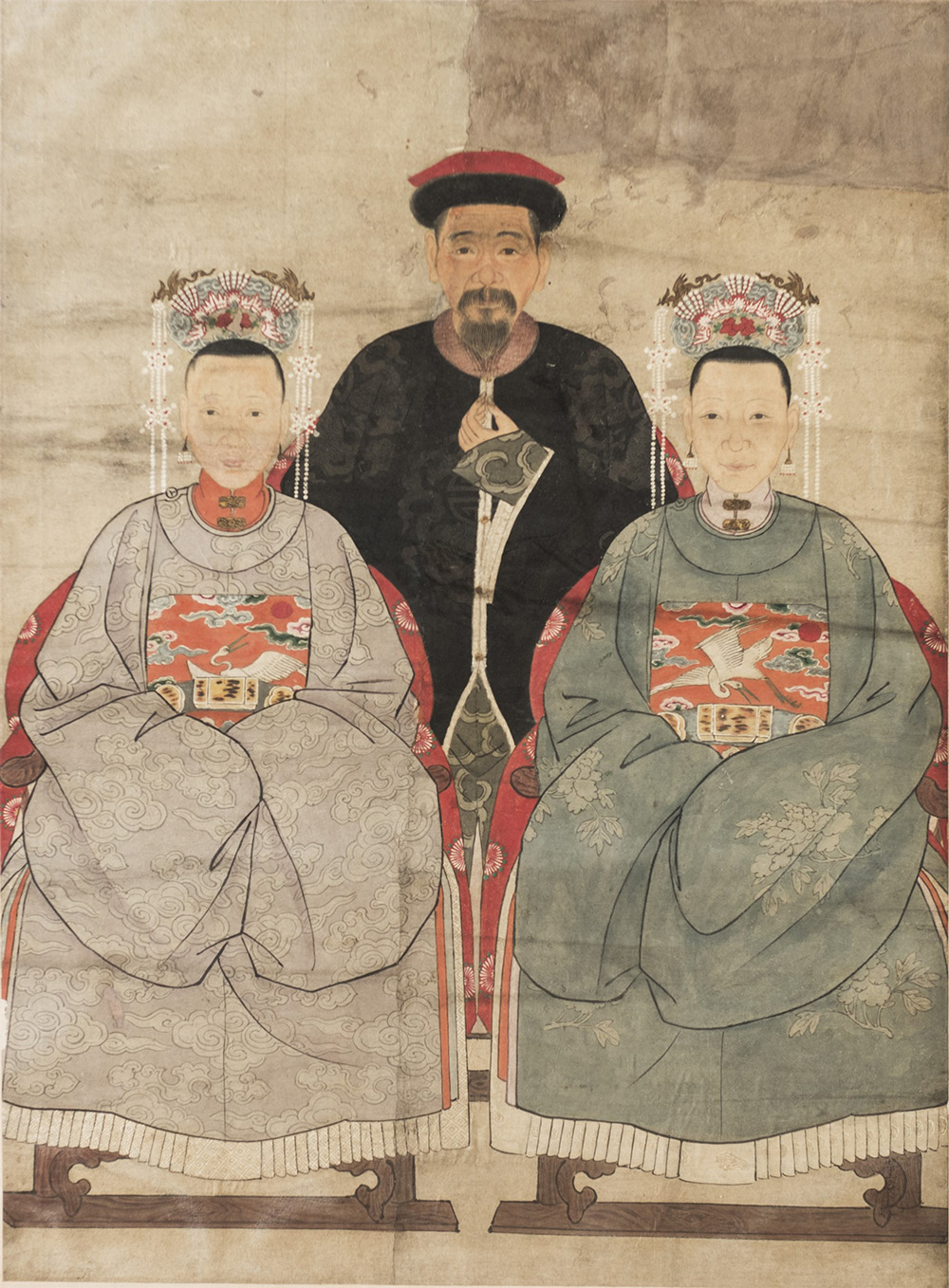 A large ancestor portrait, depicting a first-grade dignitary with his wives