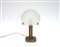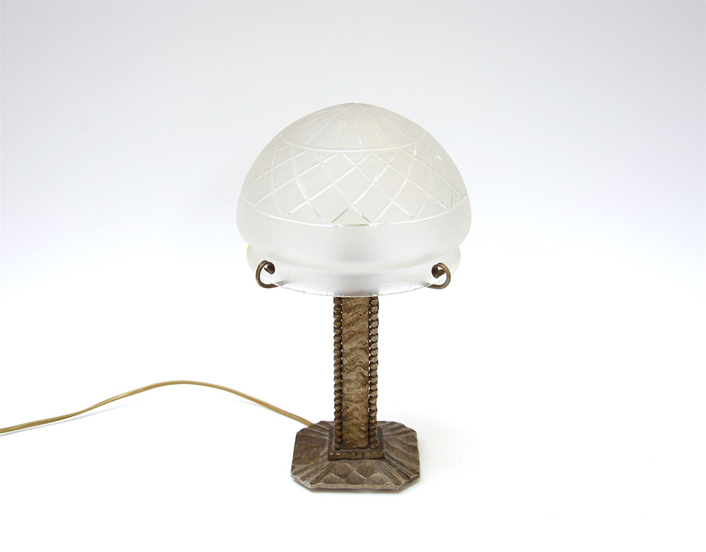Lampada da tavolo. Italia, produzione recente. Bronzo con corpo decorato a scanalature e perlinature, paralume in vetro molato. (h cm 36)