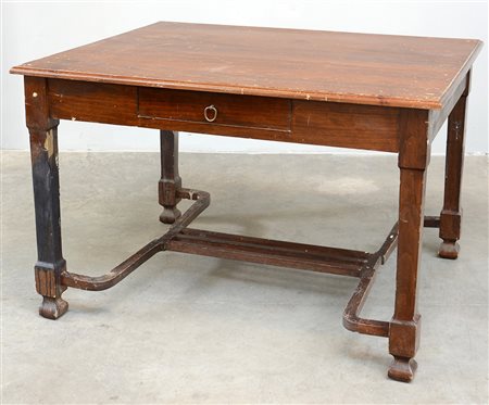 Tavolo in legno dolce con cassetto nella fascia, gambe sagomate riunite da raccordi (cm 125x81x103) (difetti)