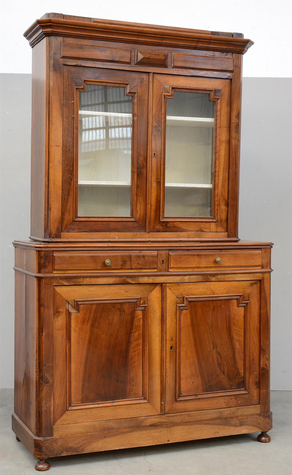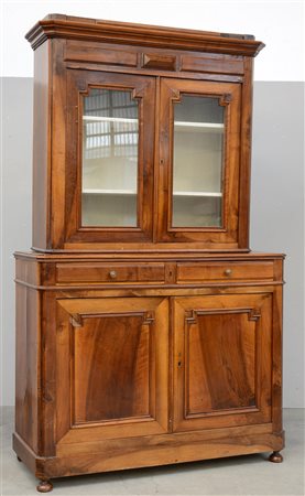 Credenza in noce a due corpi con parte inferiore a due cassetti e due battenti, alzata a vetrina (cm 127x212x51) (difetti e restauri)