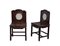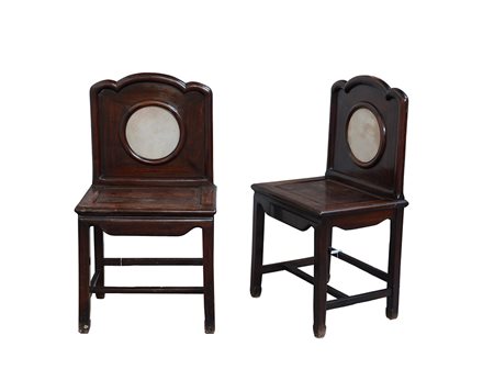 Due sedie in legno dalla seduta quadrata e schienale con placca circolare in pietra (difetti)