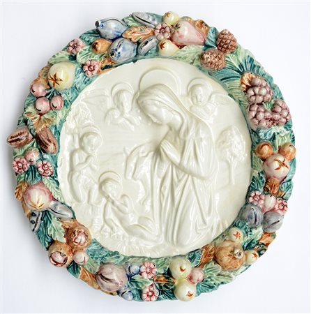 Manifattura italiana secolo XX "Natività" altorilievo in ceramica con bordo decorato a frutti policromi (d cm 38)