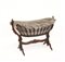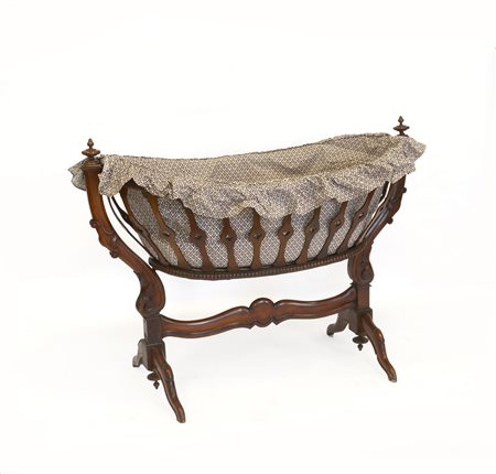 Culla in legno con montanti di forma sagomata intagliati a volute e motivi geometrici. Gambe mosse e piedi ferini. Sec. XIX (cm 92x123) (difetti)