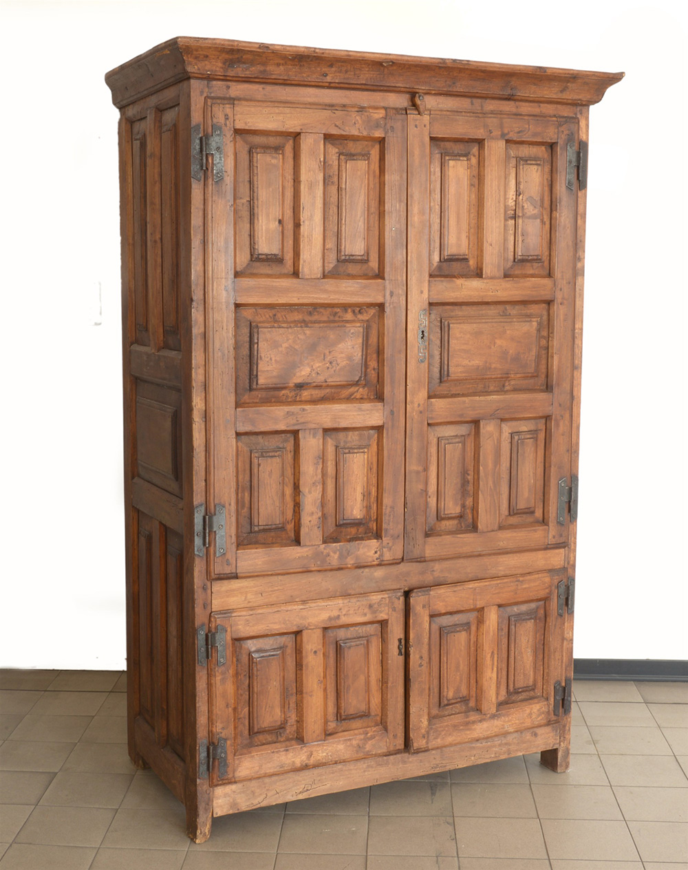 Credenza provenzale in noce a quattro ante con fronte e fianchi pannellati. Sec. XVIII (cm 110x173x60)