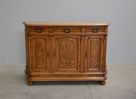 Credenza di forma sagomata in noce e radica di noce a tre cassetti in linea sottopiano e tre ante riquadrate sul fronte. Piedi torniti. Fine secolo XIX (cm 160x105x55)