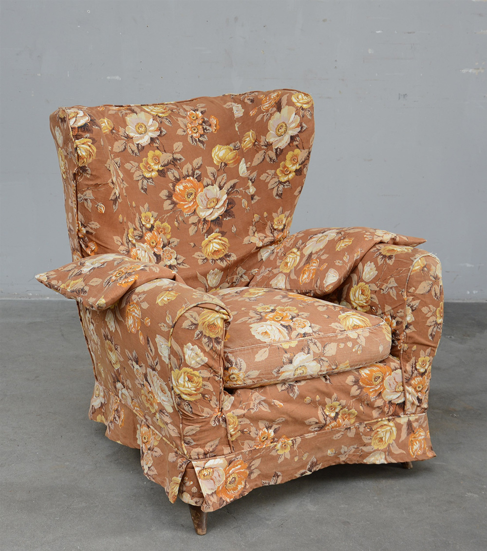 Poltrona bergère rivestita in stoffa a fiori su fondo beige. Italia, anni 50 (difetti)