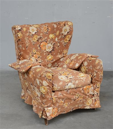 Poltrona bergère rivestita in stoffa a fiori su fondo beige. Italia, anni 50...