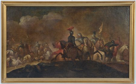 Scuola della fine del secolo XVII "Scena di battaglia" olio su tela (cm 68,5x116,5). In cornice (difetti)