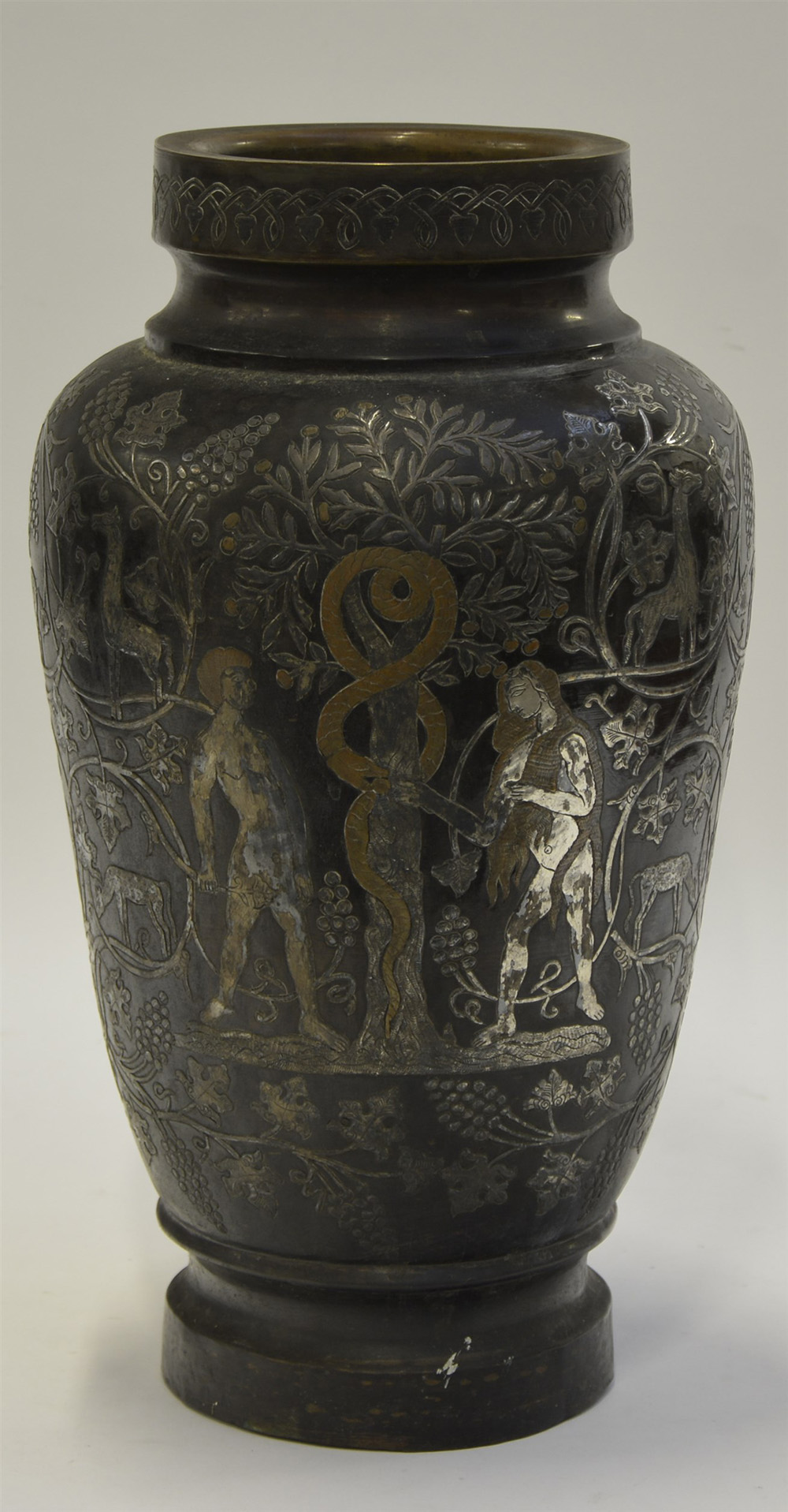 Antico vaso in rame con decori a sbalzo argentati raffiguranti "la Tentazione di Eva nel giardino dell'Eden" (h cm 44) (difetti)
