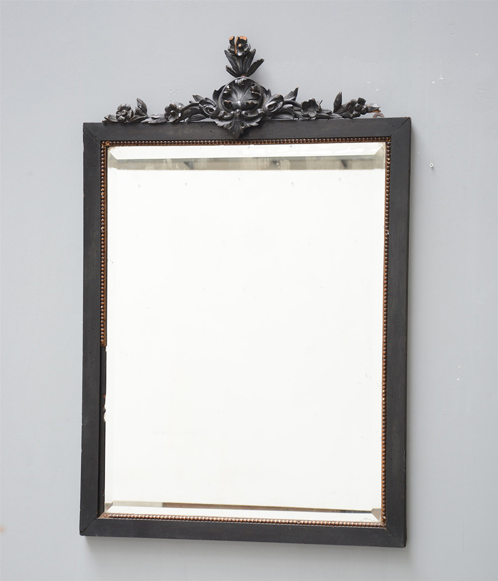 Specchio in noce con cimasa intagliata a fiori e foglie, profilo interno perlinato. Secolo XIX (cm 74x114) (difetti e mancanze)