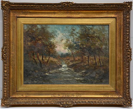 "Paesaggio boschivo con ruscello" olio su tela applicata su cartoncino (cm 25x35) firmato in basso a destra, in cornice
