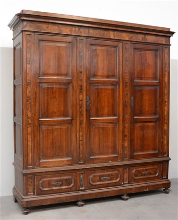 Armadio a tre ante in noce e radica a due cassetti nella base, piedi torniti. Secolo XIX (cm 210x230x61) (difetti)