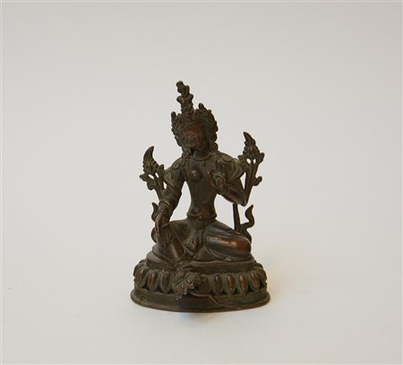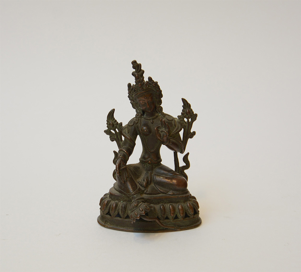 Tara verde in bronzo seduta su base con petali di loto (lievi mancanze)