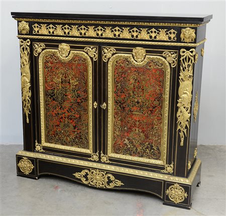 Credenza Boulle a due ante in legno ebanizzato riccamente decorata a fregi in bronzo dorato con mascheroni, rosoni a teste leonine e sui montanti simboli marziali con elmi, scudi, asce e faretre con frecce. Piano in marmo nero, fine secolo XIX (cm 126x118x39) (difetti)