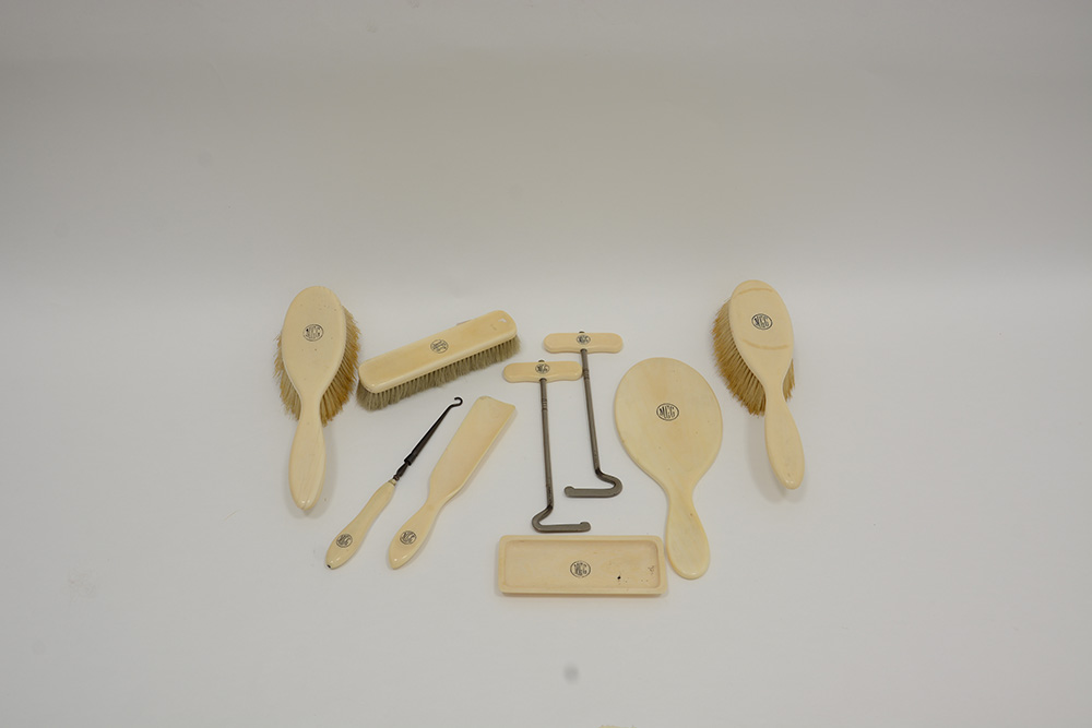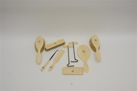 Servizio da toelette in avorio cifrato in nero “MGG” composto da: tre spazzole, uno specchio a mano, un portasapone, un calzascarpe e tre tiralacci (difetti)